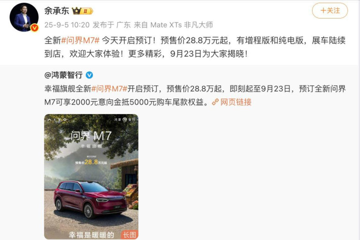余承东余总在朋友圈写下“远超预期”的那一刻,可能他自己也没有想到全新问界M7又要变成鸿蒙智行的走量车型了。43分钟10万台,是销售奇迹,更是交付大考,春节前争取交付12万台才配登上M7以前月销3万辆的辉煌历史。而鸿蒙智行计划中,走量的车型应该是尚界H5、智界R7,一旦问界M7的销量大爆发,也会虹吸一部分智界R7的量,甚至还会影响到尚界下一款中高端车型H7。从28.8万元起的预售价和主要竞争30万元级市场来看,全新问界M7还是给友商留下了生存空间,不仅是鸿蒙智行内部的考虑,就连理想L6和i6可能都松了一口气。