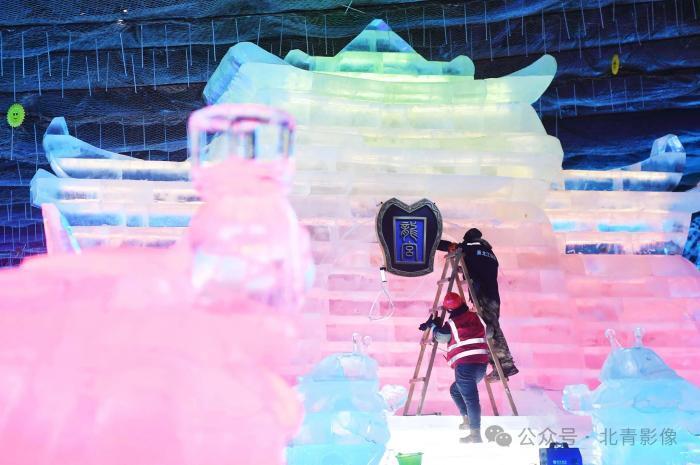 高达13.6米的“南天门”是今年最大的单体冰雕建筑,它与威严的“四大天王”冰雕、宛如从天而降的巨型冰瀑布等相互呼应,共同构筑出了一个璀璨壮丽、亦真亦幻的冰雪童话世界。2025年12月20日,延庆玉渡山忘忧湖畔,龙庆峡冰灯艺术节采冰仪式现场
