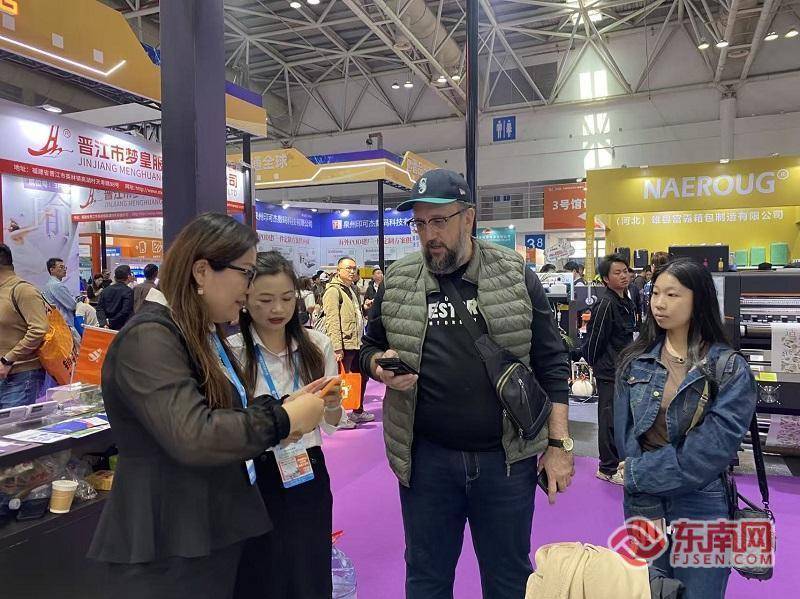 r东南网3月19日报道(记者卢金福 文/图)18日上午,第六届中国跨境电商交易会在福州开幕,厦门骏琪箱包有限公司的展馆前人头攒动。已是第六年参展的公司总经理洪文明,热情地为前来咨询的客商和跨境卖家,讲解新款定制箱包的设计亮点与企业生产优势。